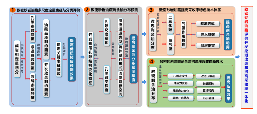 致密砂岩油藏持续高效开发关键理论技术是团队负责人近20年来在国家科技支撑计划(支持经费957万元)、国家自然科学基金、教育部科学技术研究(重点项目)、陕西省科学技术研究发展计划和油田科技攻关等112个项目、超过5000万经费的持续资助下总结凝练出来的,该技术主要包括4方面内容:①致密砂岩油藏多尺度定量表征与分类评价②致密砂岩油藏剩余油分布预测③致密砂岩油藏提高采收率特色技术体系④致密砂岩油藏剩余油挖潜压裂改造新技术,最终实现致密砂岩油藏评价开发挖潜改造和提高采收率一体化。